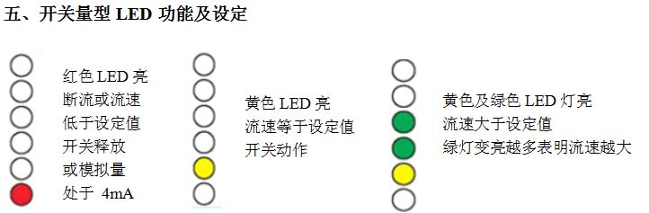 將流開關(guān)裝好,使介質(zhì)以需要監(jiān)測的流速流動,擰開面板上的螺絲,調(diào)整電位計, 使第一個綠色LED怡好變亮。此后當(dāng)流速低于當(dāng)前值時,開關(guān)就釋放(紅燈亮)。若要使開關(guān)點比當(dāng)前流速小,可調(diào)整電位計(順時針旋轉(zhuǎn)螺絲刀)使綠色 LED多亮一些。