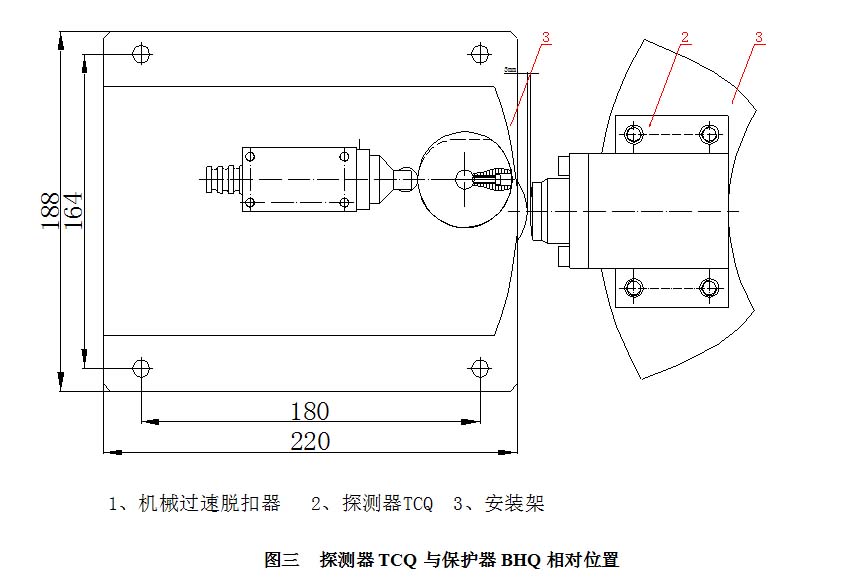 3、安裝過速保護器BHQ(由業(yè)主自己根據(jù)現(xiàn)場情況配裝,應有足夠的空間供保護器完成手動復位)及過速保護器BHQ的安裝螺栓不能完全緊固,以便于后面調整,安裝時要求液壓閥中心高度與過速探測器在同一高度,同時脫扣裝置的一邊與主軸中心線重合(如圖三),然后鎖緊螺栓。