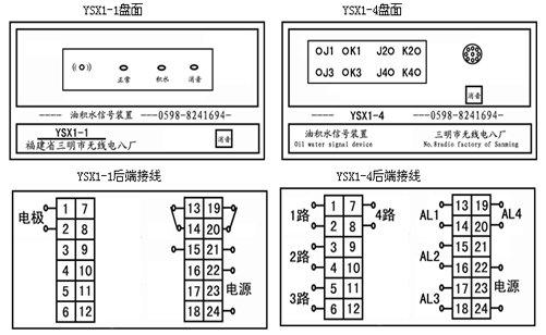 YSX1油積水信號(hào)裝置安裝于油箱底部。當(dāng)油箱內(nèi)油混有水并沉積于底部電極裝置時(shí),信號(hào)裝置內(nèi)的集成控制電路能發(fā)出報(bào)警信號(hào),運(yùn)行人員可打開(kāi)電極裝置的Gl/4直嘴旋塞把水放掉。YSX1-1為一路監(jiān)測(cè)配套儀表;YSX1-4為4路監(jiān)測(cè)配套儀表。