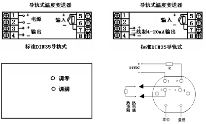 對導(dǎo)軌式溫度變送器輸入可以是熱電偶、熱電阻、標(biāo)準(zhǔn)信號(hào)。工作電源接端子1、2,4~20mA輸出信號(hào)接3正、4負(fù);對二線制4~20mA輸入信號(hào)正接5、負(fù)接6;熱電阻單端A5、并聯(lián)端BC分別接6、7。