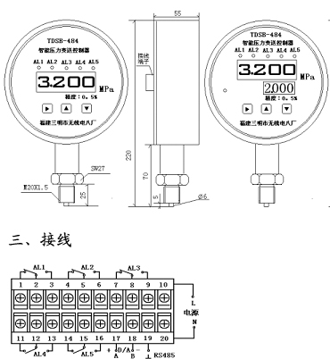 TDSB-484ZL系列壓阻式智能數(shù)顯壓力變送器、控制器是集壓力測(cè)量、顯示、控制于一體的多功能產(chǎn)品。該產(chǎn)品為全電子數(shù)字技術(shù)。結(jié)構(gòu),前端采用帶隔離膜充油芯體的壓阻式壓力傳感器,輸出信號(hào)由高精度、低溫漂和高可靠性的放大電路轉(zhuǎn)換為標(biāo)準(zhǔn)信號(hào)。它使用方便,參數(shù)在儀表盤(pán)面設(shè)定,廣泛應(yīng)用于電力、自來(lái)水、水處理、石油、化工、冶金等行業(yè),對(duì)流體介質(zhì)的壓力進(jìn)行監(jiān)控,是指針電接點(diǎn)壓力表的理想替代產(chǎn)品。