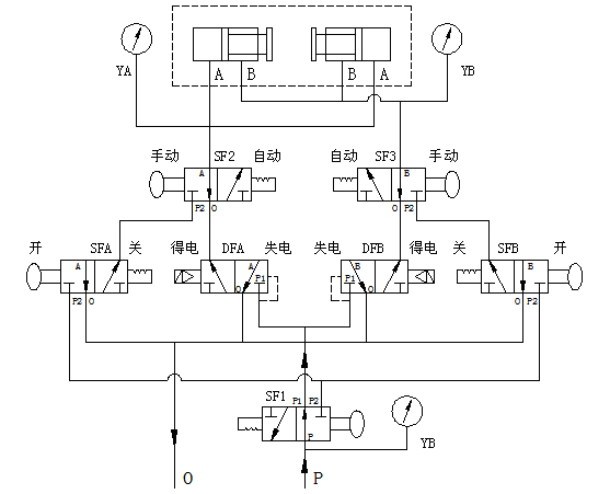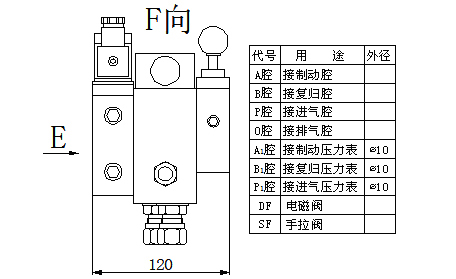自動(dòng)剎車:電磁閥線圈處于失電狀態(tài),手拉閥SF1、SF2、SF3往里推至自動(dòng)狀態(tài),過(guò)濾后壓縮氣體從進(jìn)氣腔(P腔)進(jìn)入集成塊。當(dāng)接收到停機(jī)指令時(shí),制動(dòng)電磁閥DFA得電開閥,使壓縮氣體進(jìn)入制動(dòng)腔(A腔), 從而實(shí)現(xiàn)對(duì)制動(dòng)器的投入, 加速機(jī)組的制動(dòng)停機(jī);